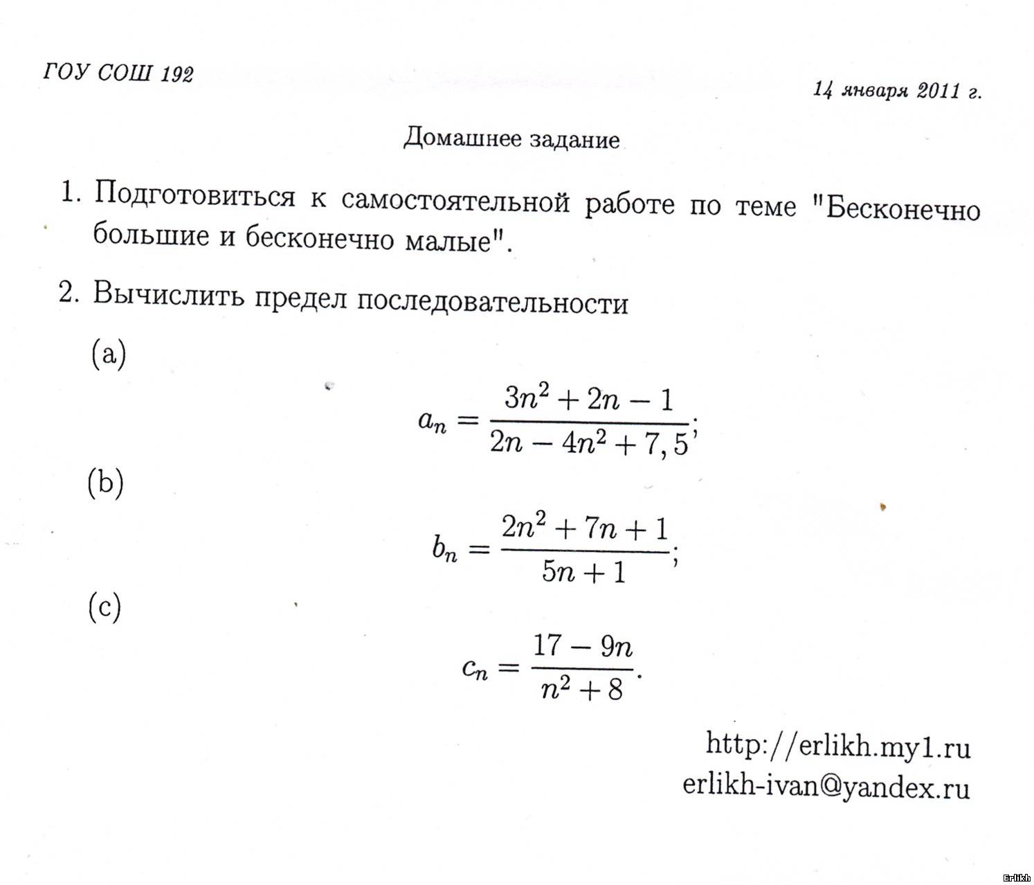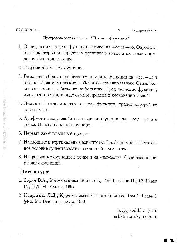 | В четверг (31 марта) состоится устная самостоятельная работа по теме "Предел в точке". Самостоятельная состоит из трех разделов: 1) Доказательство того, что число является пределом функции в точке по определению. Упражнение 1(1,2,3) 2) Доказательство того, что число не является пределом функции в точке по определению. Упражнение 3(1,3) 3) Подсчет предела.Упражнение 4(3,4,6), 5(7,9,10,11), 6(3,5,10,16,18) Упражнения из задачника Вавилова и др., Начала анализа. глава 4, параграф 1. В этом же параграфе в начале разобраны примеры решений интересующих нас задач. Нам нужны примеры 1,2,3,5,6,7,9,10.